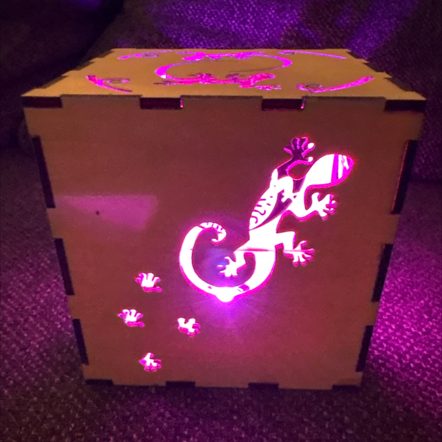 un jolie objet Lumineux de 10x10x10 aux faces ajourées, le tout éclairé par led pilotable avec la télécommande fournie.