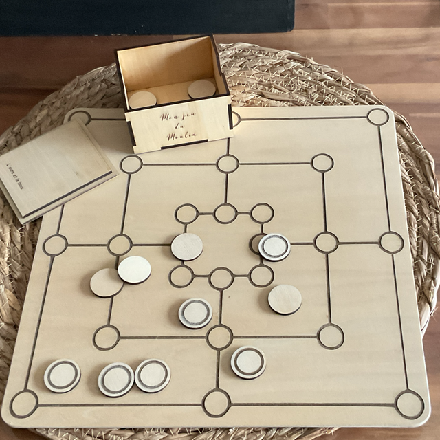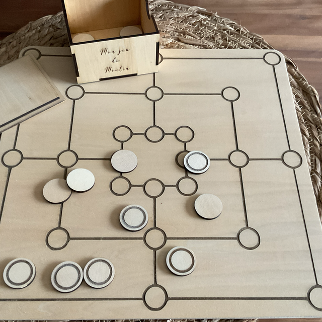 Le jeu est composé d’un plateau gravé de 29 cm est de 18 Jetons