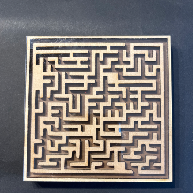 Jolie labyrinthe composé de 2 plateaux puzzle en peuplier collés sur une plaque de noyer puis recouvert de deux feuilles de plexi.